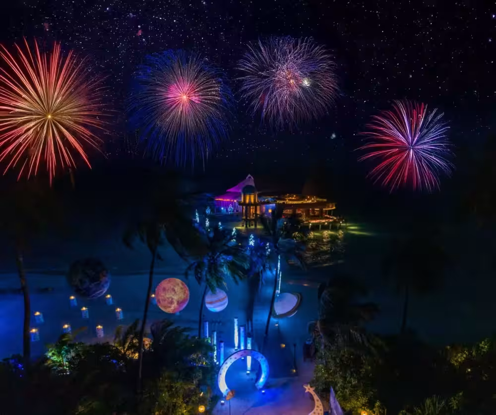 New Year’s Eve promises an unforgettable evening under the stars, starting with cosmic-themed cocktails by the sea. The night will feature a lavish Gala Dinner showcasing world-class dishes, live cooking stations, and energetic entertainment, before culminating in a vibrant countdown beneath the Maldivian night sky.