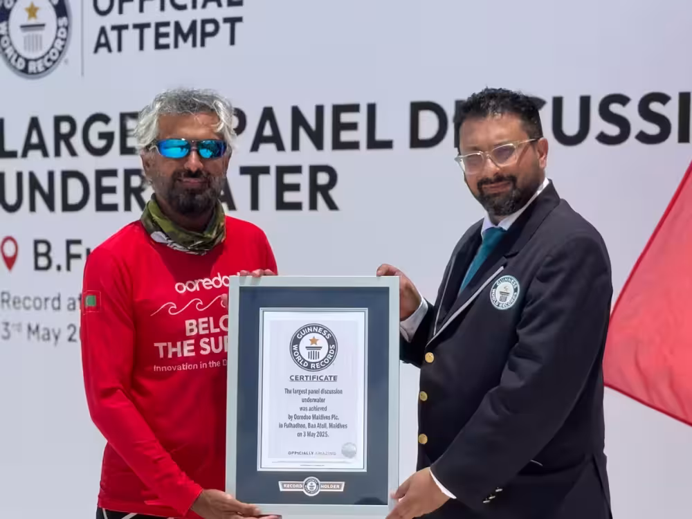 Ooredoo Maldives has secured a place in the Guinness World Records by staging the largest underwater panel discussion, a remarkable feat that highlights its pioneering role in the nation's digital evolution. Held in the stunning, turquoise depths of Baa Fulhadhoo, the event featured five panelists, each delivering a speech lasting over two minutes while fully submerged, captivating a unique underwater audience.